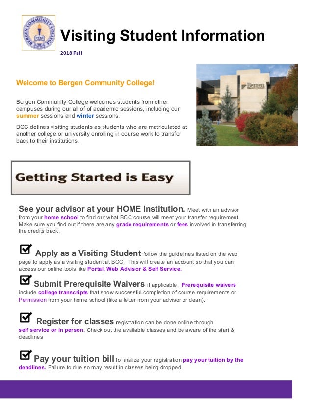 Bergen Community College welcomes visiting students from other institutions to register for. The total tuition and living expense budget for in-district residents to go to Bergen. Classes take place Monday-Thursday.
